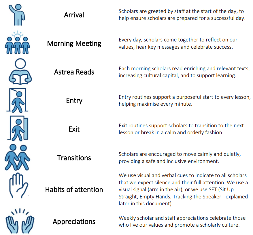 At Astrea Academy Dearne, we have a series of daily practices called ‘core routines’, designed to ensure that we provide an environment and culture that is safe, inclusive and enables scholars to focus on their learning and social development.