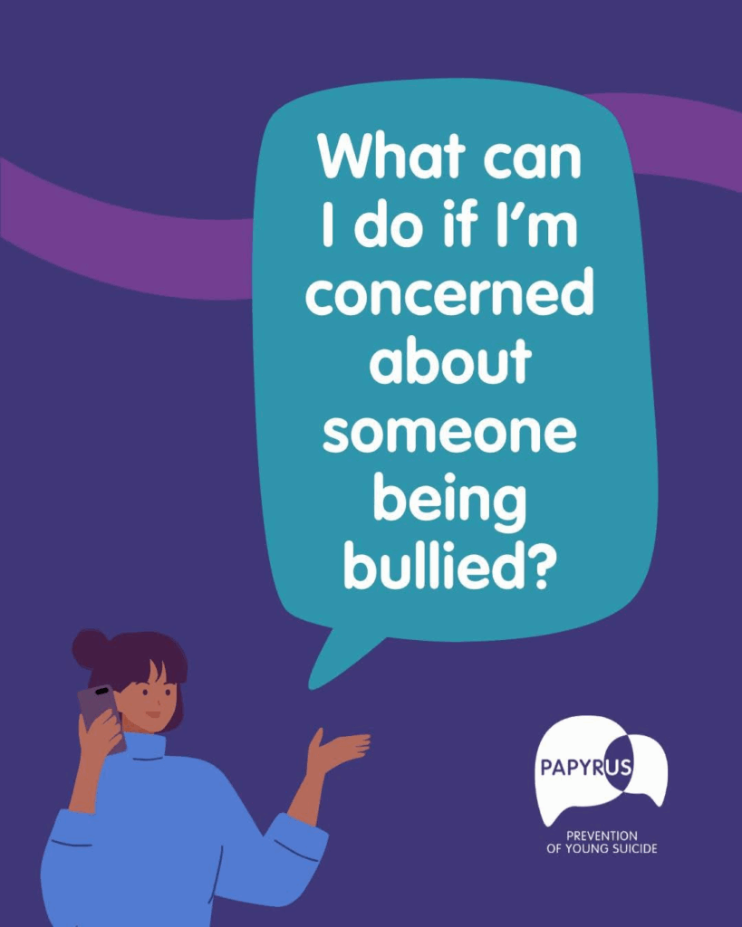 If you are concerned about a young person who may be experiencing bullying, you play an important role in providing support and guidance. Papyrus put together tips on what steps you can consider, and organisations you can reach out to or support.